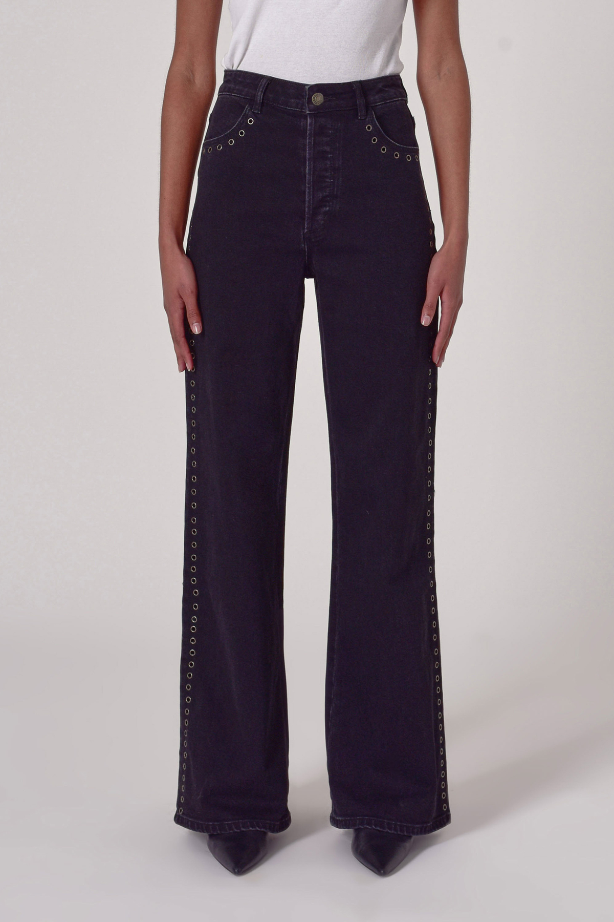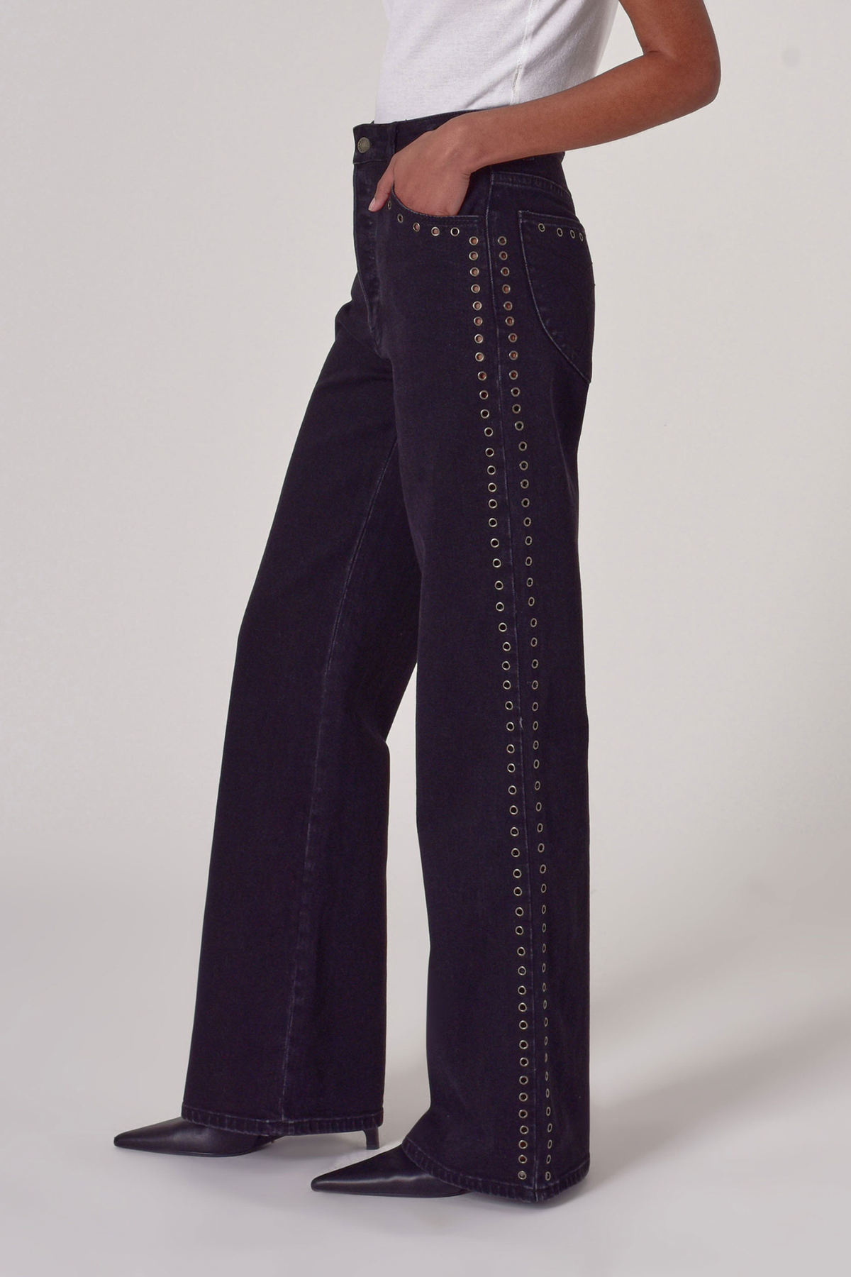 This is a super high-rise, wide leg jean, made with a rigid denim. Fits true to size.