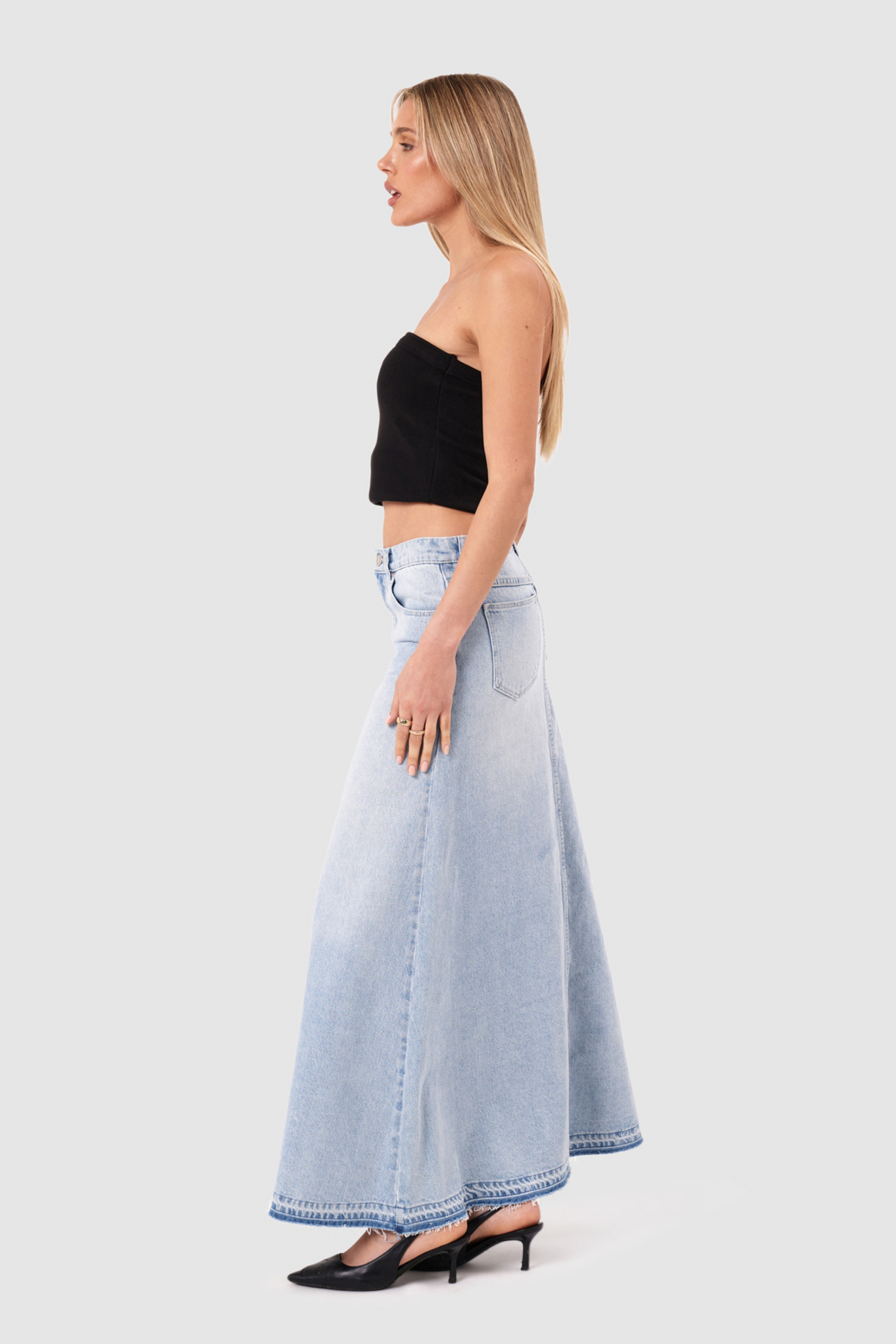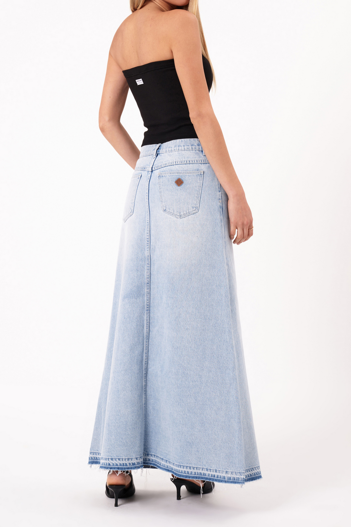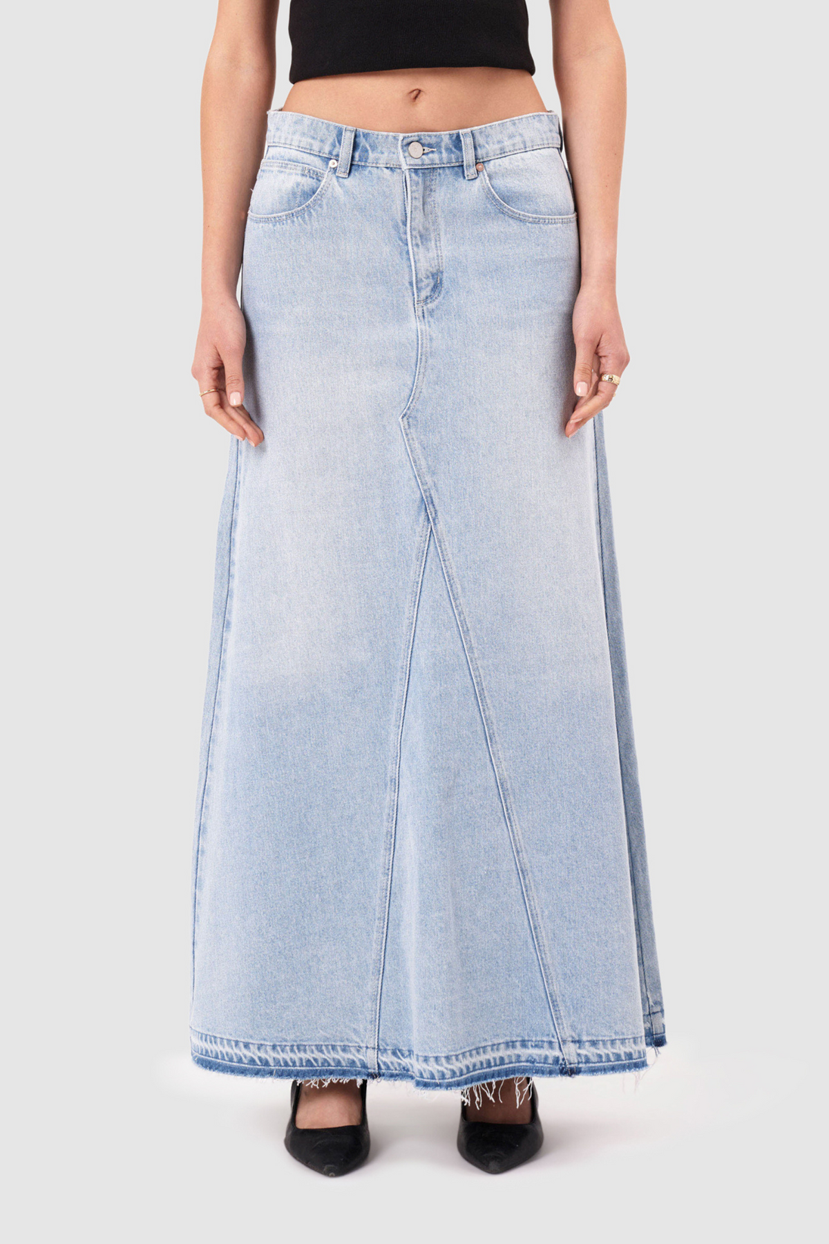 The 95 Maxi Skirt in Gina is a mid rise, maxi skirt made with non-stretch rigid denim.