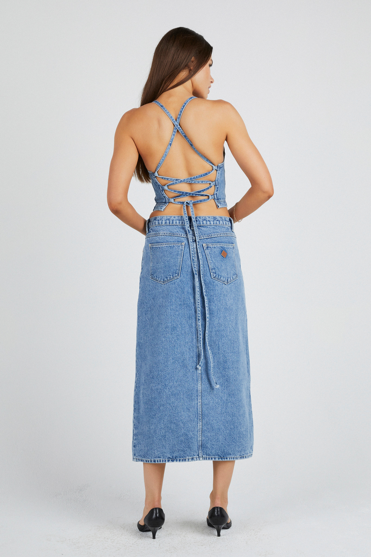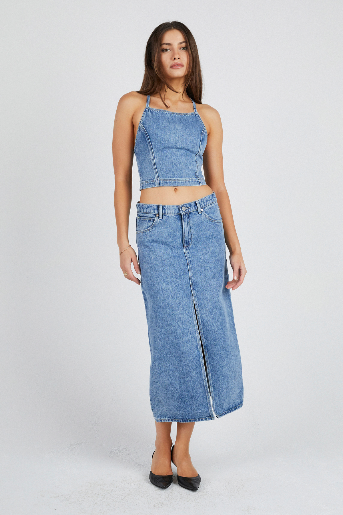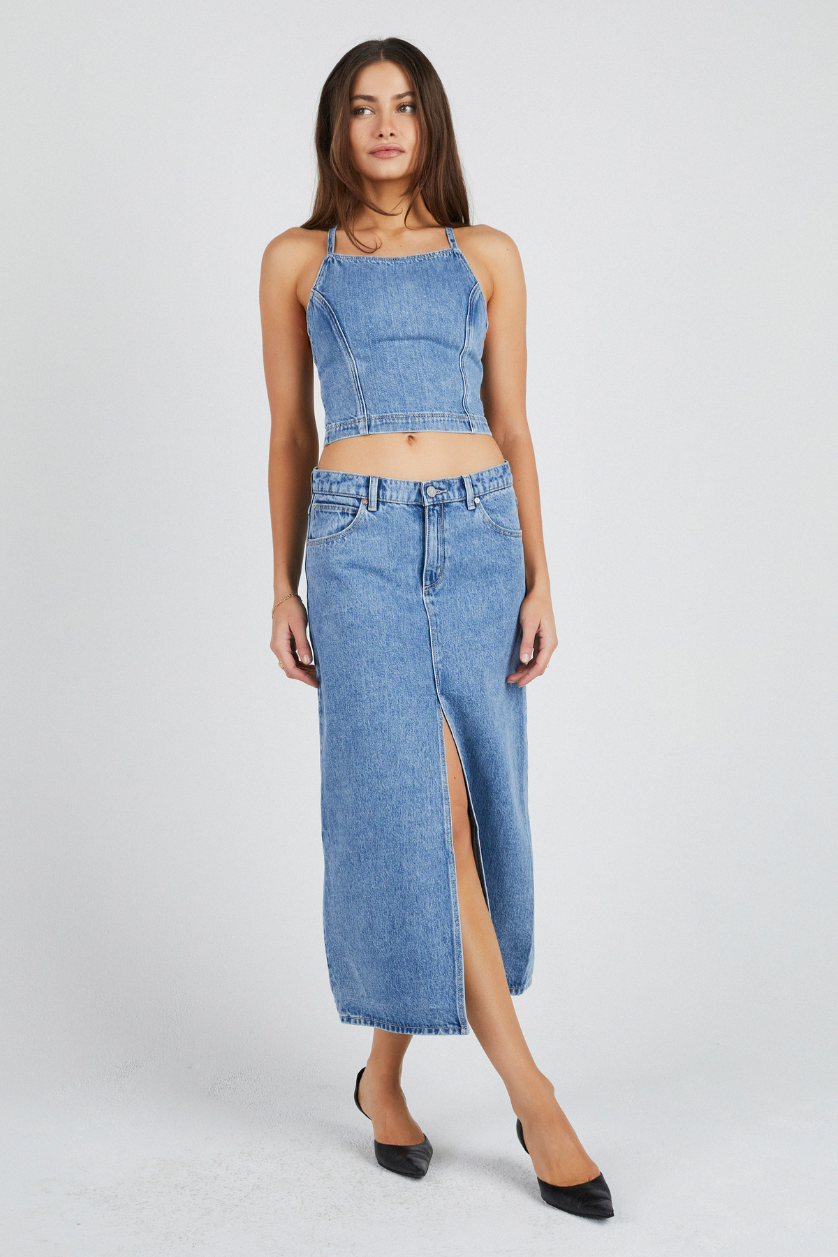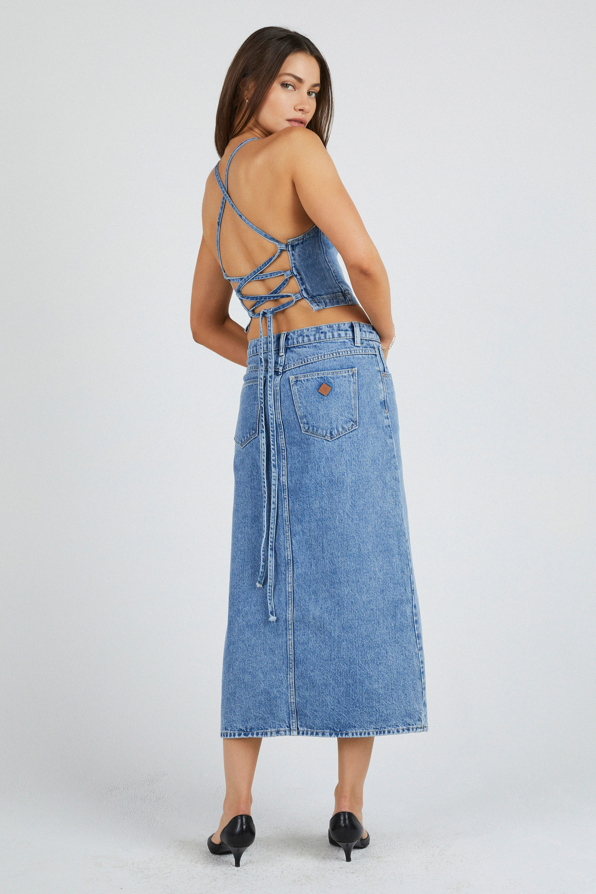 The 99 Maxi Skirt in Tianna Recycled is a low rise, maxi skirt made with non-stretch rigid denim.
