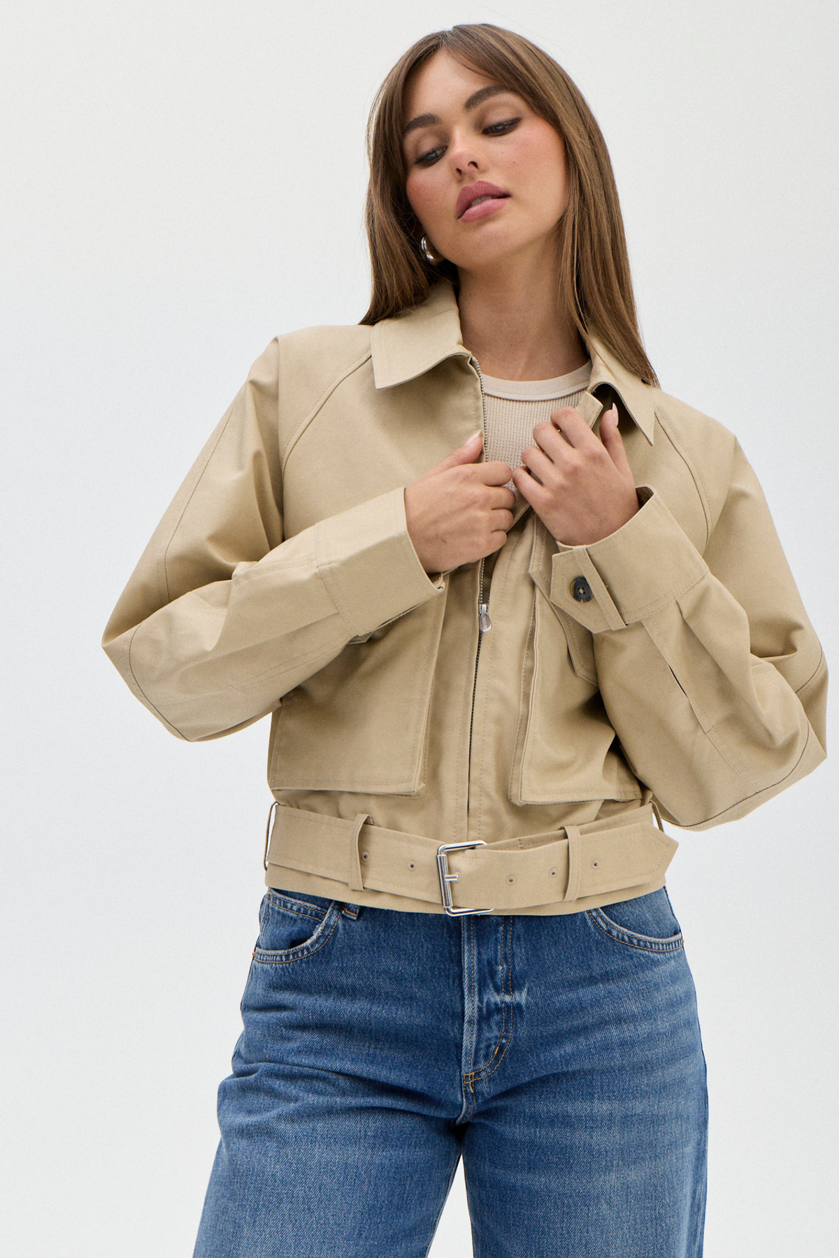Structured and boxy cropped trench-style jacket with a modern utilitarian edge