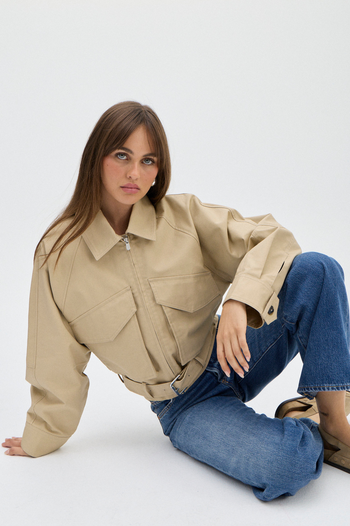 Oversized patch pockets and a detachable belt with silver buckle offer functional detail