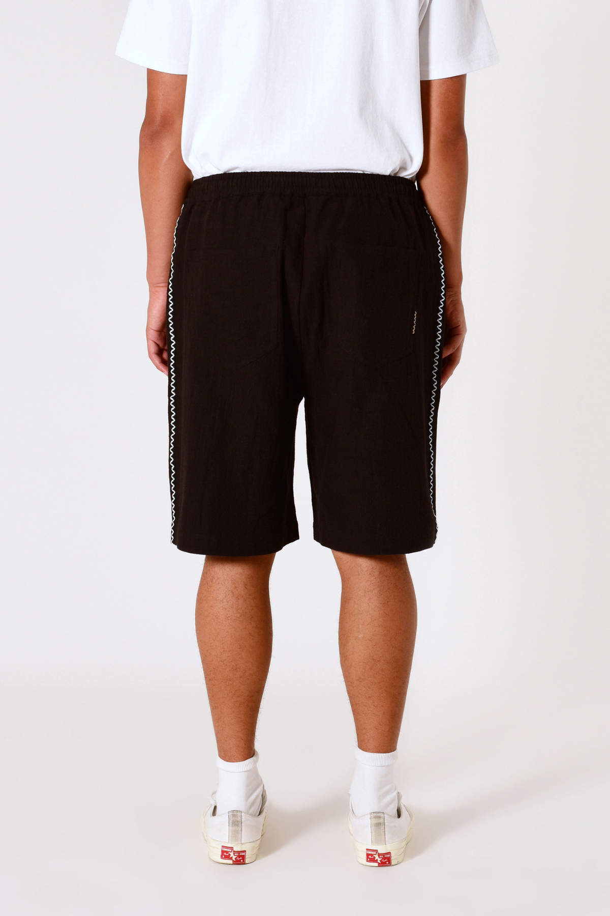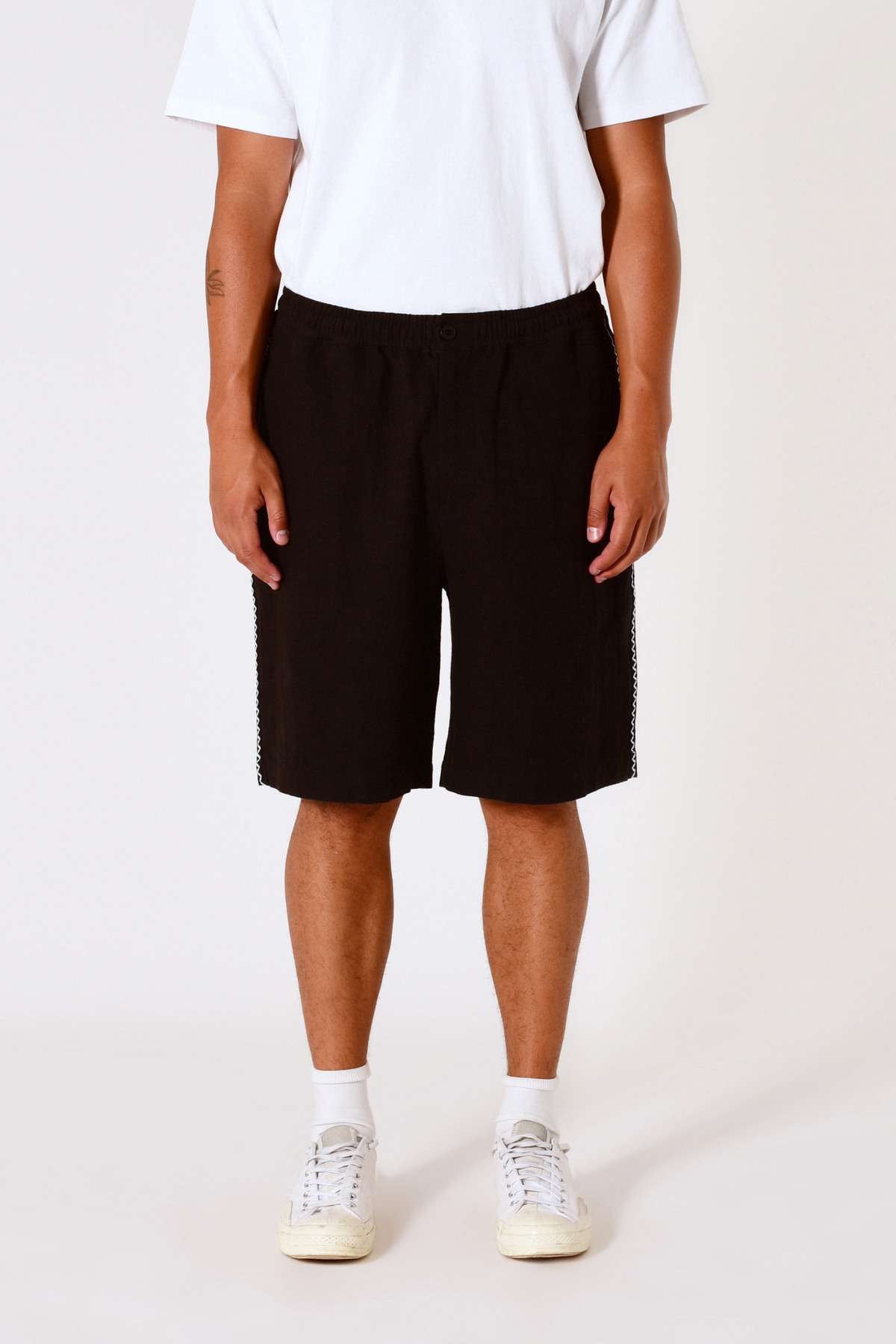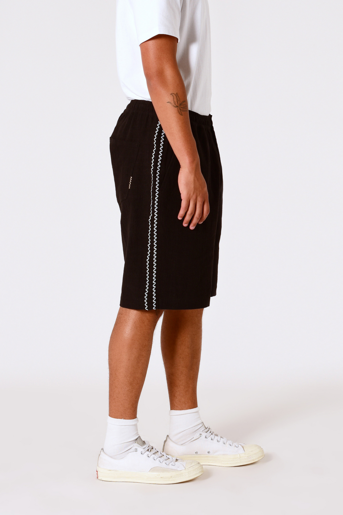Blending the relaxed simplicity of Scandinavian design with casual resort styling, the Resort Short is cut with a super relaxed fit through the seat and a longer, looser fitting leg designed to finish just on or below the knee for a cooler take on a summer short. With a jacquard pattern tape stripe on the sides, an elasticated drawstring waistband, and a zip fly, the Cruise Short combines elements of tailoring with more casual resort and sportswear influences for a versatile and easy-to-wear style.