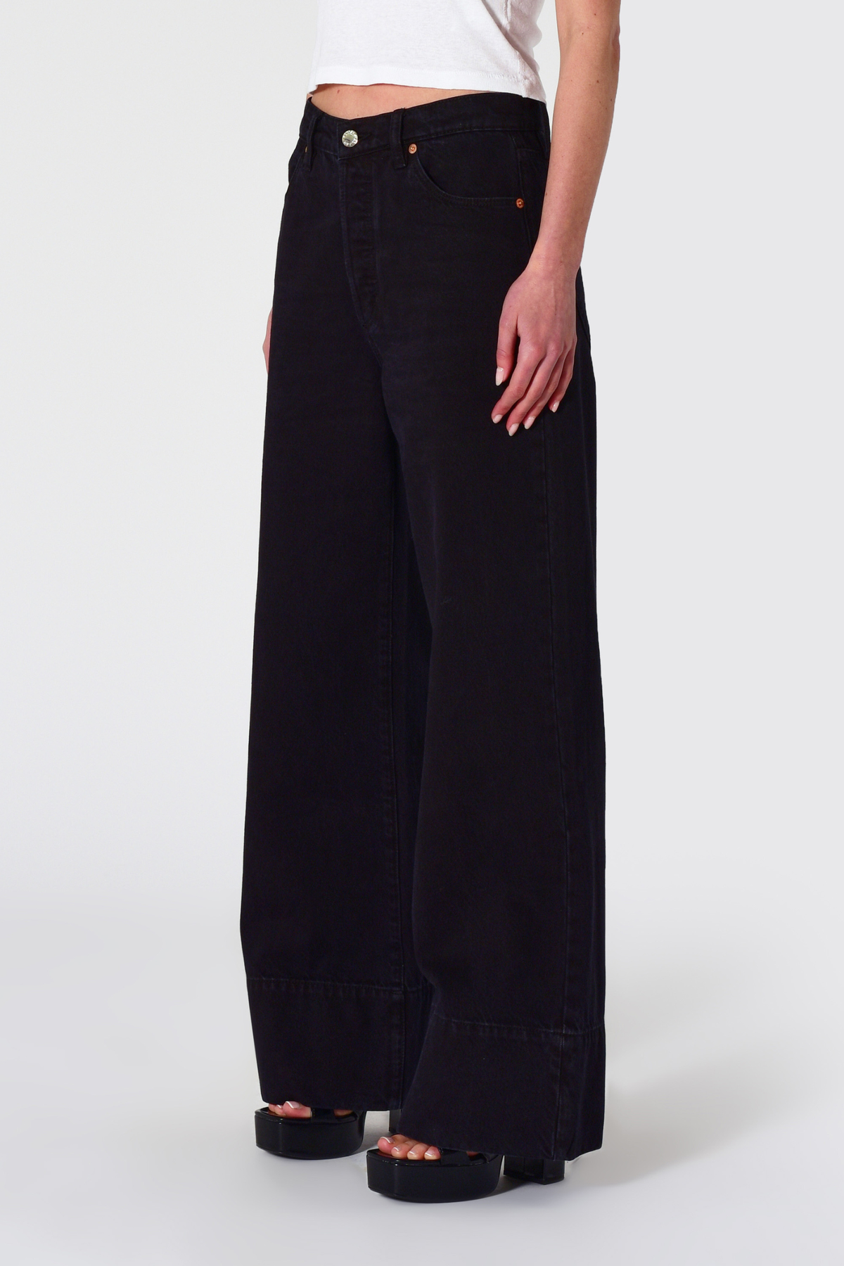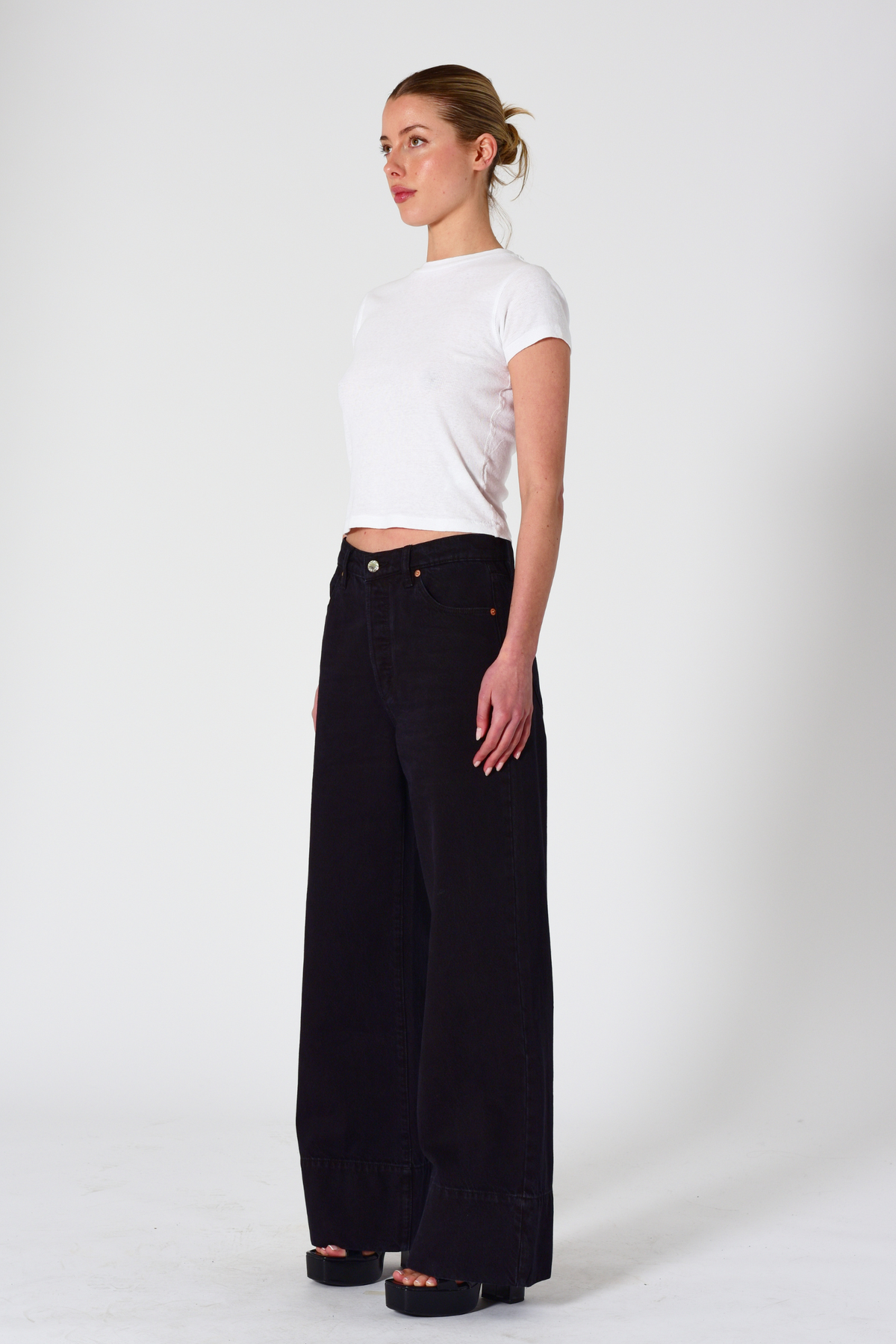 This is a high-rise, wide leg jean, made with a non stretch denim. Fits true to size.