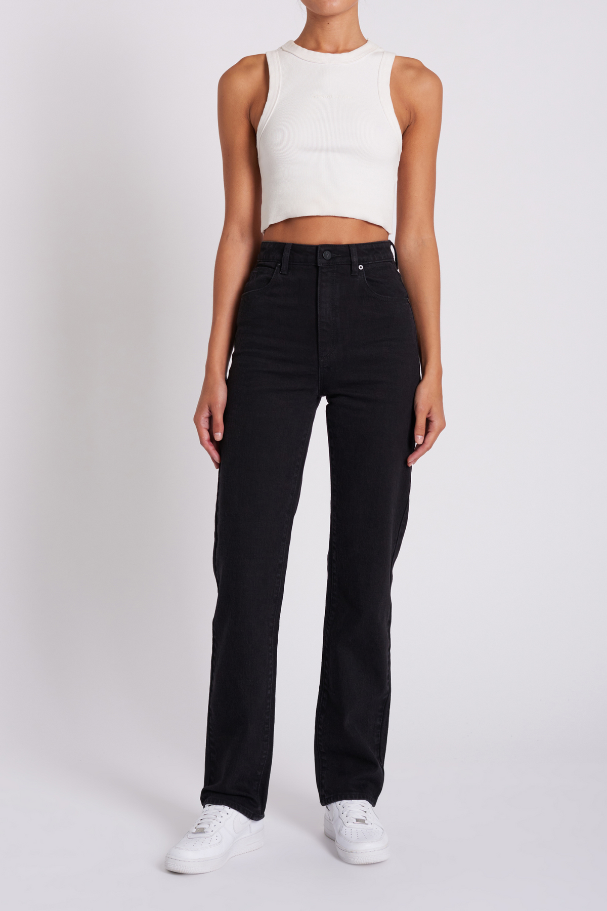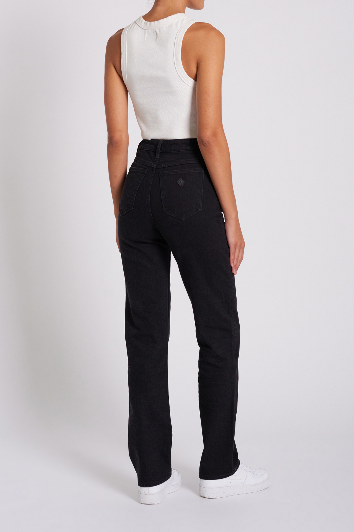 The 94 High Straight in Blacklight is a high rise, straight leg jean made with non-stretch denim.