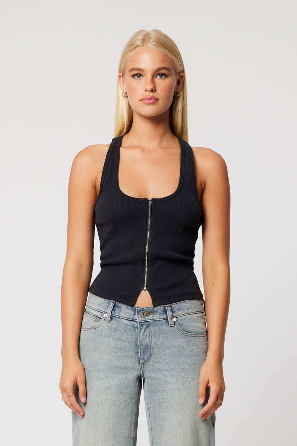 Perfect for styling up or down, it’s designed with a flattering curved neckline, finishing at the hip and a centre-front zip that adds both detail and shape