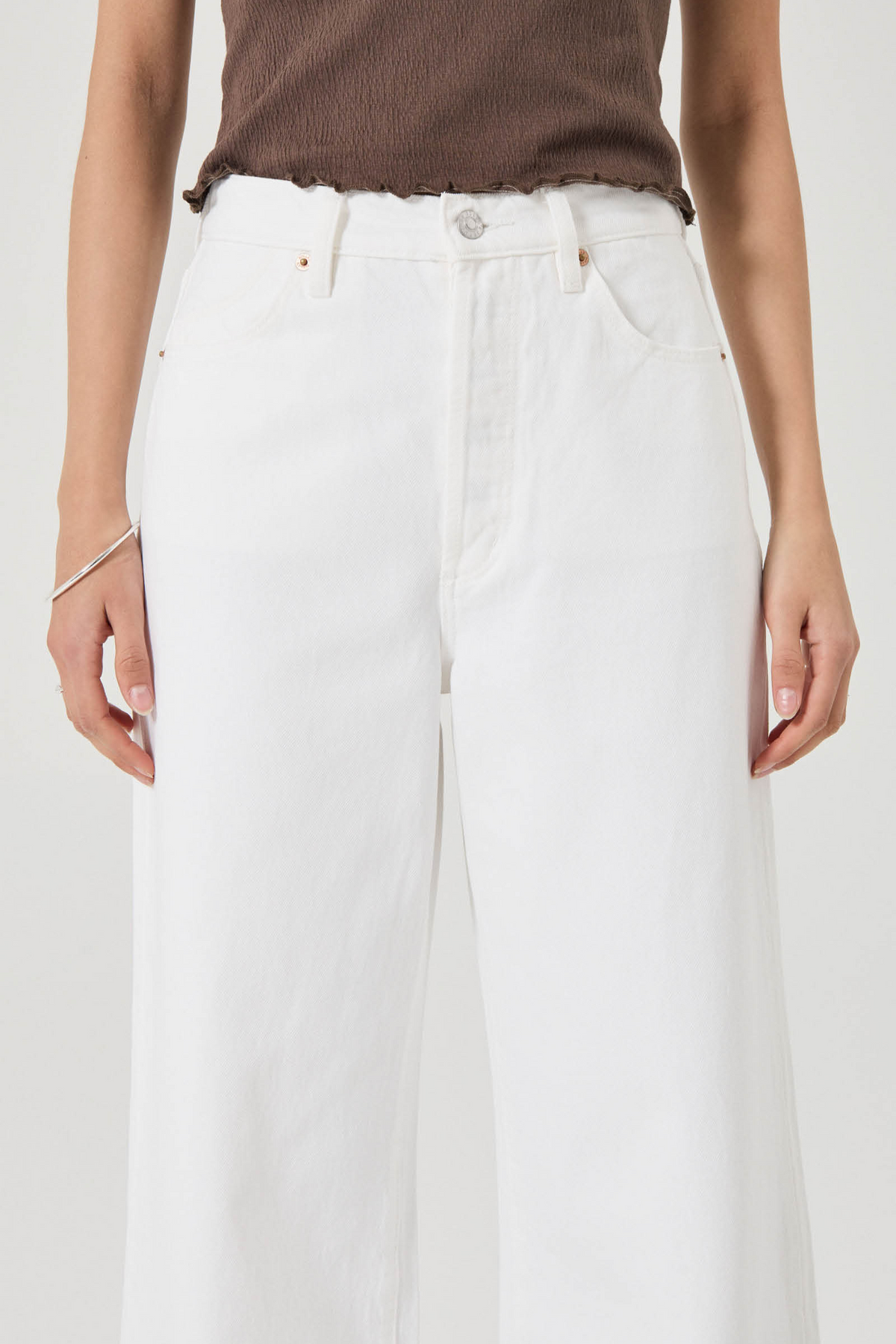 This is a high-rise, wide leg jean, made with a non stretch denim. Fits true to size.